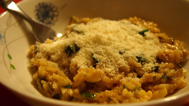 Dýňové rizoto má krásně jemnou krémovou chuť, a i když je to jídlo kalorické, je velmi zdravé. Recept pro 2 osoby.