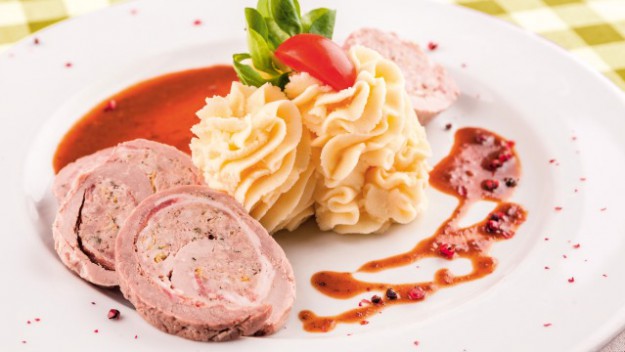 Vepřovou roládu plněnou směsí z mletého masa, sýrů provolone dolce a piccante a italské pancetty servírujte s bramborovou kaší.